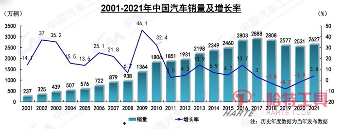 圖3 2001-2021年國內(nèi)汽車銷量及增長率