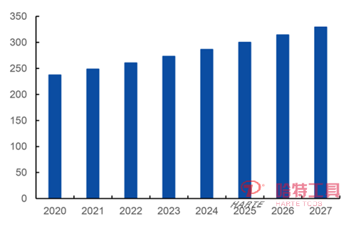 全球金屬切削工具市場規(guī)模達到237.3億美元,預計在2020至2027年間將保持4.8%年復合增長率,并在 2027年達到 329.5 億美元。中國刀具消費規(guī)模在2005至2020年間保持7.75%年復合增長率,2020年約為421億元。考慮制造業(yè)轉(zhuǎn)型升級趨勢不改,“十四五”期間刀具消費市場有望迎來進一步增長,邁上新的臺階。