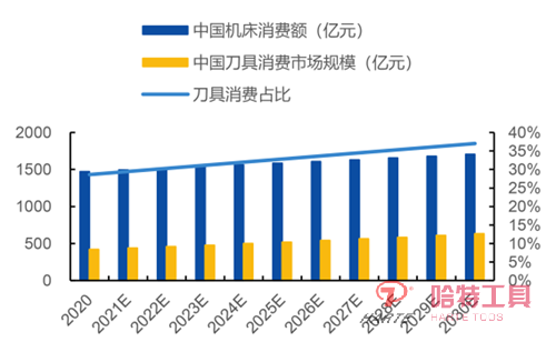 發(fā)達國家數(shù)控刀具與數(shù)控機床協(xié)調(diào)發(fā)展,刀具消費額約為機床消費額的50%左右,而國內(nèi)由于機床總數(shù)控化率較低,刀具消費額占比較低。假設伴隨中國制造業(yè)轉(zhuǎn)型升級,2030年中國刀具消費在機床消費額占比有望達到37%,同時中國機床消費額以 1.5%年復合增長率增長,中國刀具市場規(guī)模有望在2030年達到631億元,2020至2030年復合增長率達4.14%。